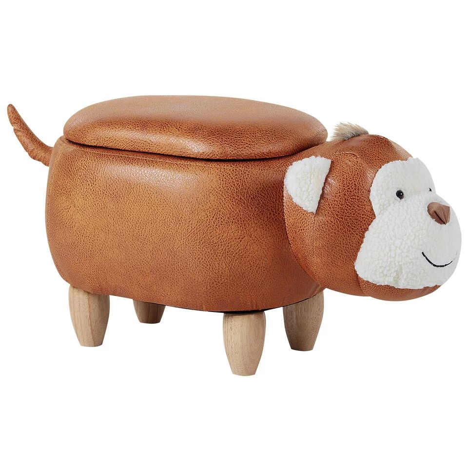 Moderne dieren krukje. Deze prachtige poef in de vorm van een aapje zal je kindje zeker pleizer brengen en de kamer opvrolijken. Het krukje is bedekt met kunstleer dat duurzaam en gemakkelijk schoon te maken is. Het geheel wordt ondersteund door houten pootjes die de stabiliteit garanderen. Er is een verborgen opbergruimte onder het zitje waardoor je kind gemakkelijk de favoriete speelgoedjes kan opbergen. Het lachende gezichtje van dit aapje zal iedereen opvrolijken.