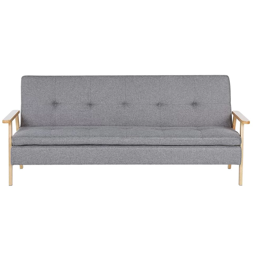 Gestoffeerde slaapbank. Deze bank is een praktische maar stijlvolle toevoeging aan elke moderne woonkamer. Dankzij zijn moderne, maar toch eenvoudige ontwerp past de bank perfect bij minimalistische en traditionele interieurstijlen. Op maat gemaakt in een duurzame maar zachte beige polyester bekleding, het stuk heeft houten armleuningen poten in een lichtte houttint, wat het stuk een retrogevoel geeft. Het kan makkelijk in een comfortabel bed of in een liggende postitie worden omgezet dankzij het handige klik-klakmechanisme.