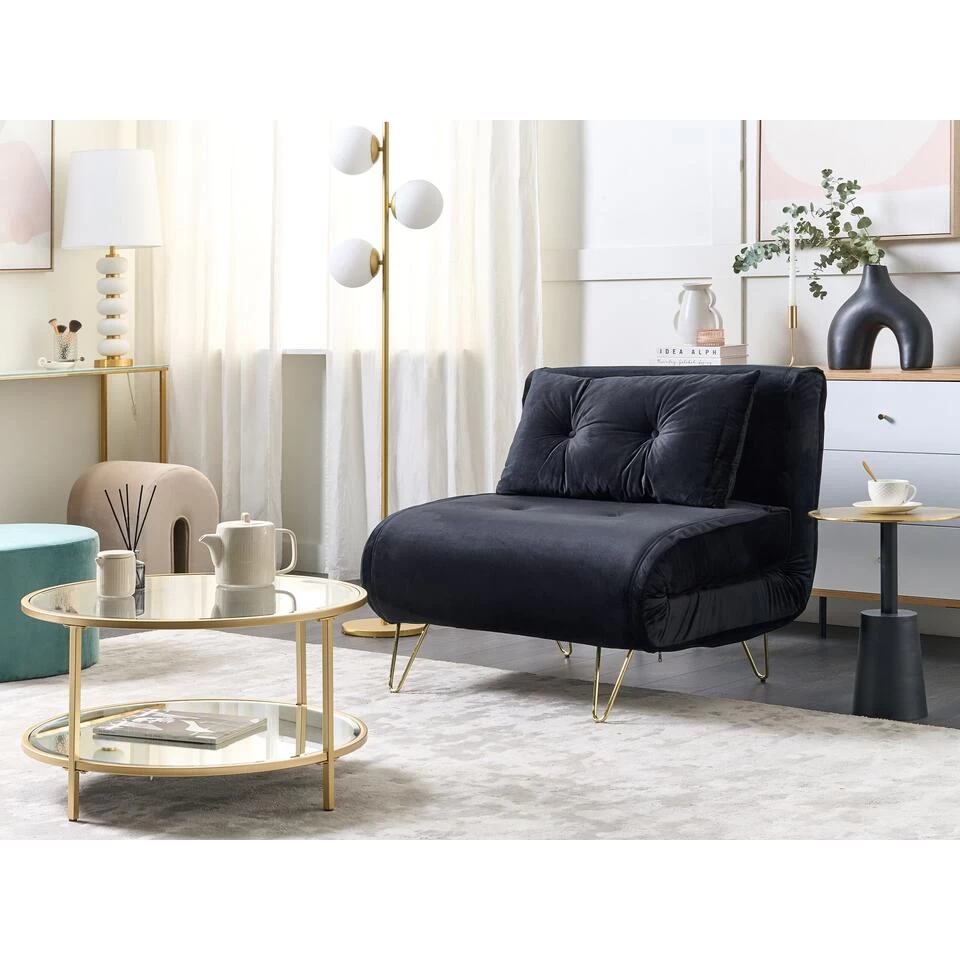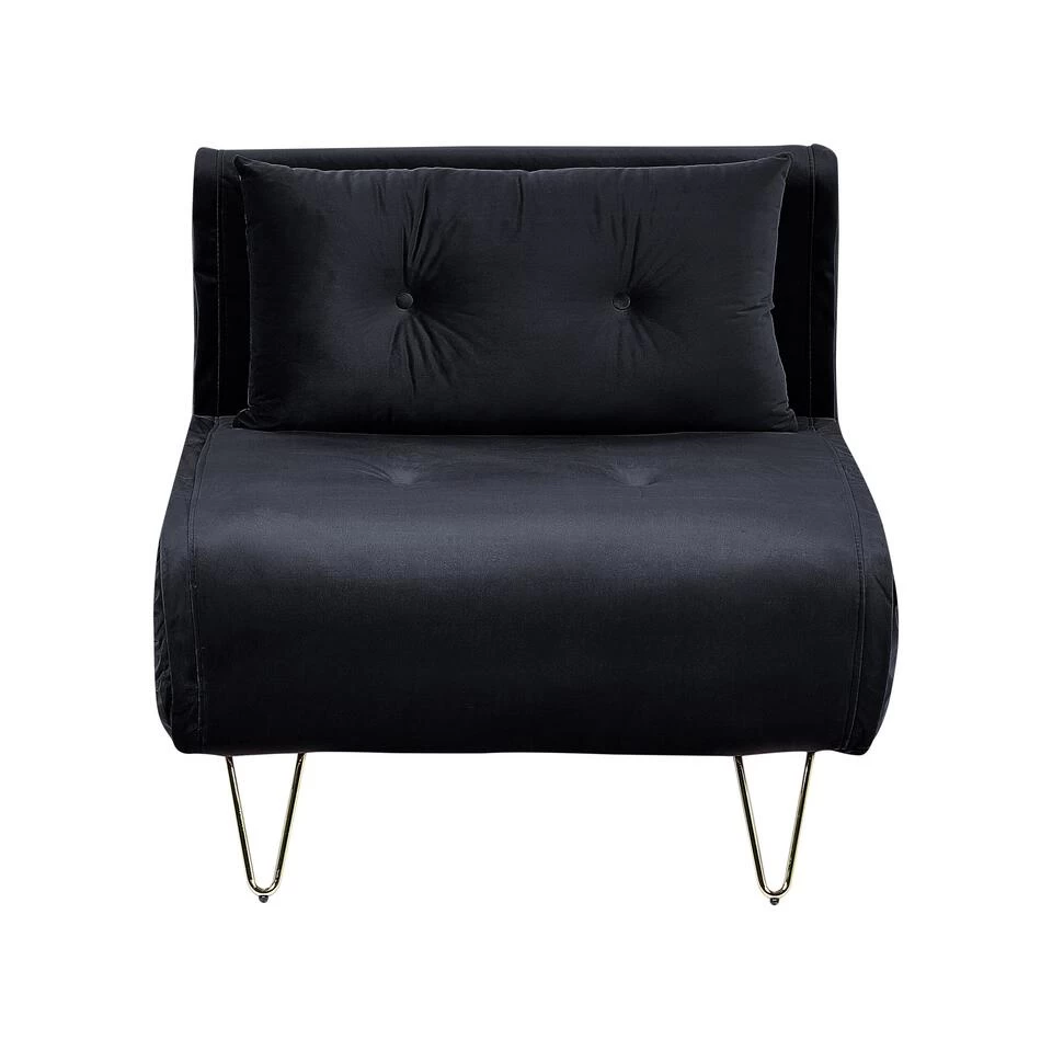 Indrukwekkende fluwelen bank met bedfunctie en sierkussen. Breng een glamoureus gevoel in je interieur met deze functionele slaapbank. De stoffering is gemaakt van zacht en duurzaam fluweel en heeft een dikke vulling waardoor de bank heerlijk comfortabel is. Het luxe uiterlijk van de bank wordt geaccentueerd door de gouden metalen poten. Het extra kussen met knopen heeft een afneembare hoes wat charme en knusheid toevoegt. Daarnaast kan de bank ook worden gebruikt om op te slapen waardoor je altijd ruimte hebt voor gasten.
