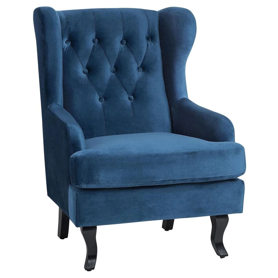 Fauteuil van donkerblauw fluweel. Deze salonfauteuil is, dankzij de comfortabele bekleding, moeilijk te overtreffen als het gaan om comfort. Of het nu gaat om een leesstoel of een tv-stoel – deze gezellige oorfauteuil maakt indruk met zijn zithoogte en zijn licht hellende rugleuning. De gebogen en donkere houten poten en de lange rugleuning geven de beige salonstoel iets majestueus. De opzettelijk geplaatste knopversieringen op de rugleuning ronden het elegante ontwerp van de stoel af.