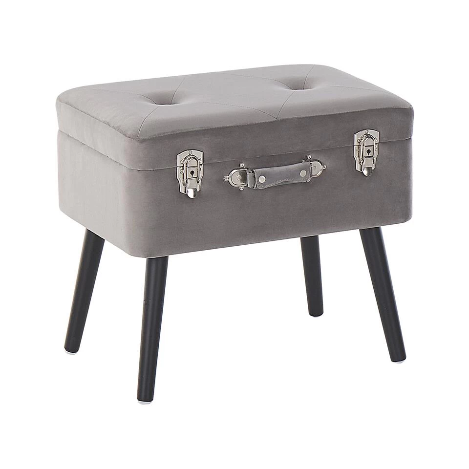 Hocker met koffer-look. Deze vintage geïnspireerde hocker is bekleed met grijs polyesterfluweel en heeft decoratieve knopen, glanzende zilveren scharnierende gespen en een stijlvolle handgreep. De hocker kan worden geopend als een echte koffer en biedt veel opbergruimte voor kleine dingen. De slanke, elegante poten geven de hocker een minimalistische touch.