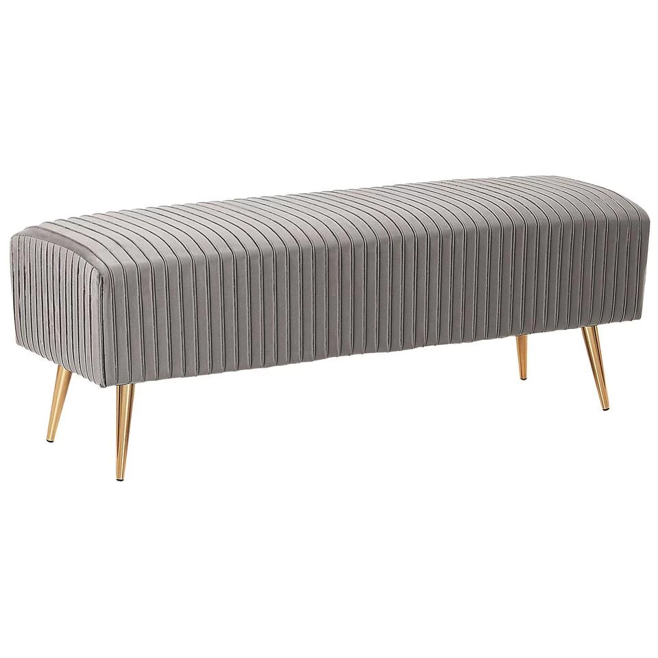 Lichtgrijze, fluwelen bank met elegante goudkleurige poten. Deze elegante, gestoffeerde voetenbank van fluweel geeft een vleugje glamour aan elk interieur. Deze voetenbank onderscheidt zich door een hoogwaardige afwerking met een fluweelzachte stof met een unieke gestreepte structuur. De stof van de bank past perfect bij de goudkleurige poten. De rechthoekige bank kan ook gebruikt worden als voetenbank of extra zitje of als plek om je kleding neer te leggen en is daarmee een praktische toevoeging aan iedere woonkamer, slaapkamer en hal.