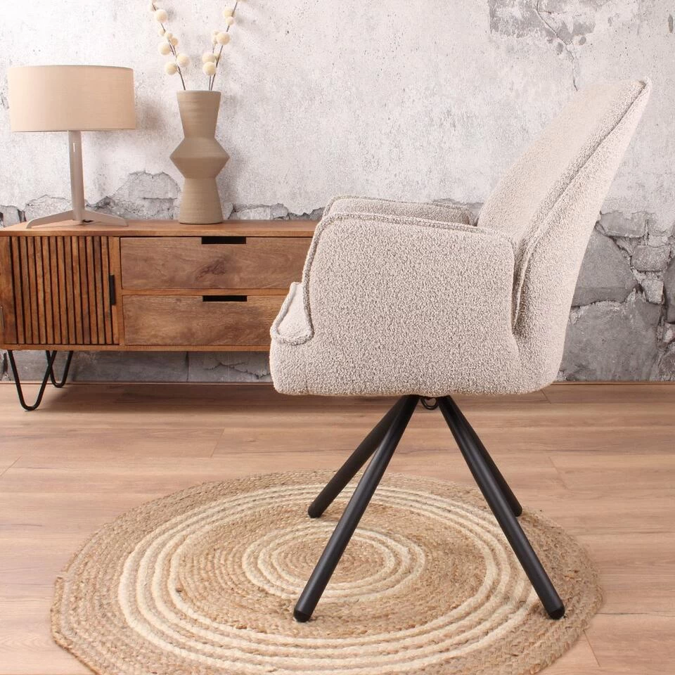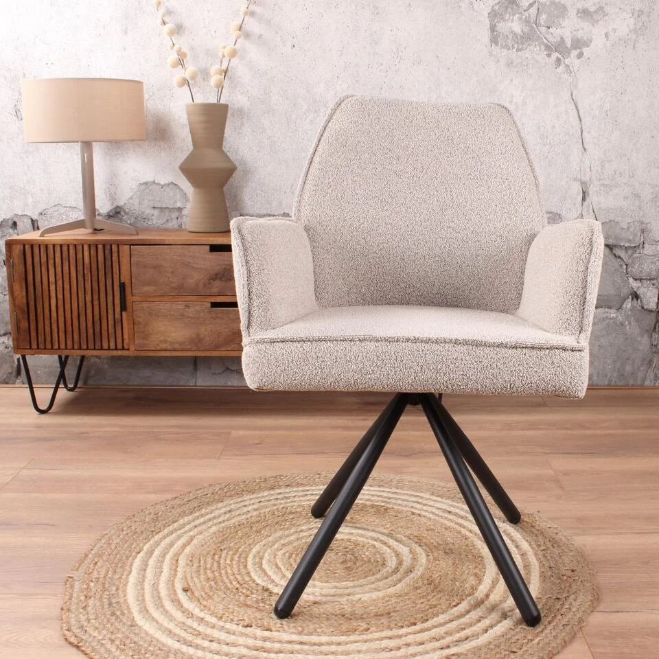 Stijlvol, comfortabel en stoer! Dat zijn de kenmerken van Lucio. Het bijzondere van deze eetkamerstoel is dat hij draaibaar is. De zitting van deze stoel is bekleed met een mooie boucle stof. Daarnaast is de rugleuning voorzien van een sierlijk ruitpatroon. Het onderstel van deze armstoel bestaat uit vier zwarte poten vanuit het midden. Deze poot is erg stevig. Tussen het onderstel en de zitting zit de draaischijf waarmee de stoel makkelijk draait. Om deze stoel extra comfort te geven is hij uitgevoerd met armleuningen. Deze stoel komt perfect tot zijn recht in een industrieel, modern, landelijk of vintage interieur. Lucio is verkrijgbaar in drie populaire kleuren boucle: wit, beige en grijs. Daarnaast is hij verkrijgbaar met een velvet bekleding.