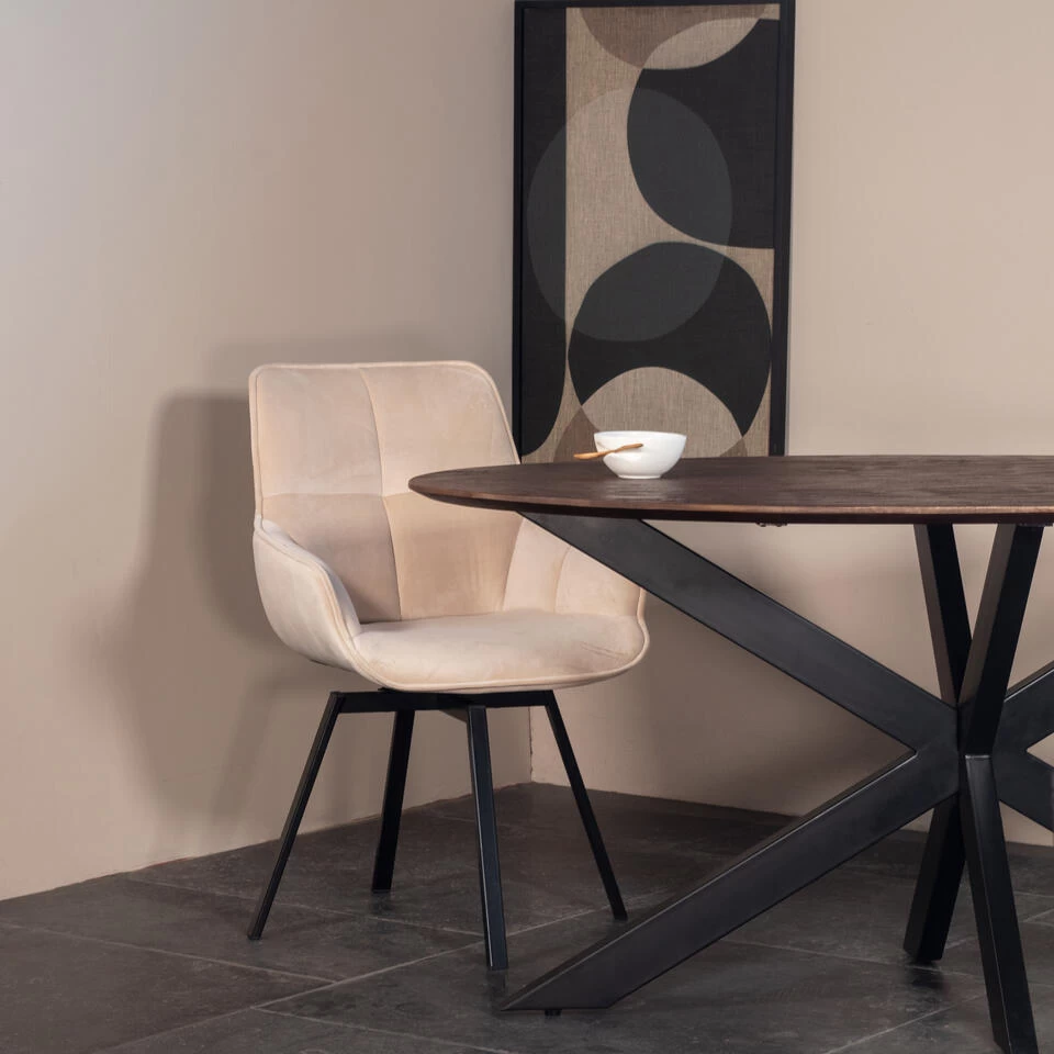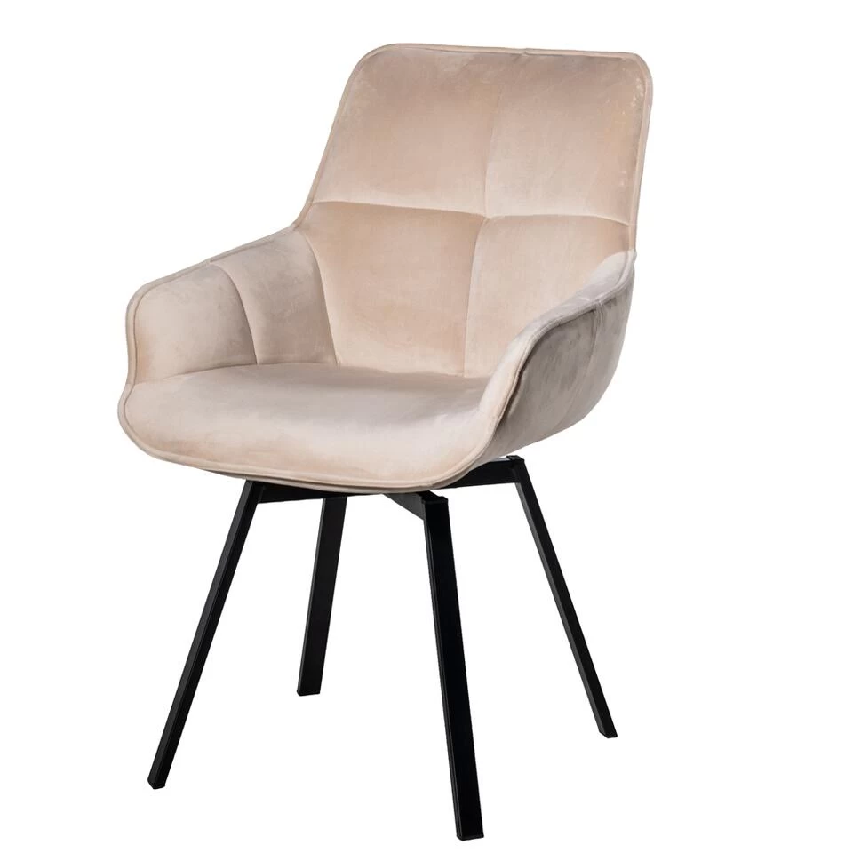 De Stoel Shannon is de nieuwe velvet stoel van Giga Meubel. Met deze stoel zit je altijd comfortabel. De rug- en armleuningen van de stoel zijn bekleed met een velvet stof. Velvet is de trend van dit moment. De poten zijn gemaakt van staal met zwarte poedercoating. Doordat de stoel draaibaar is en een makkelijke vorm heeft, is deze stoel goed te gebruiken als bureaustoel, eetkamerstoel of als fauteuil in de woonkamer. De stoel is erg leuk in een industrieel, modern of urban chique interieur.