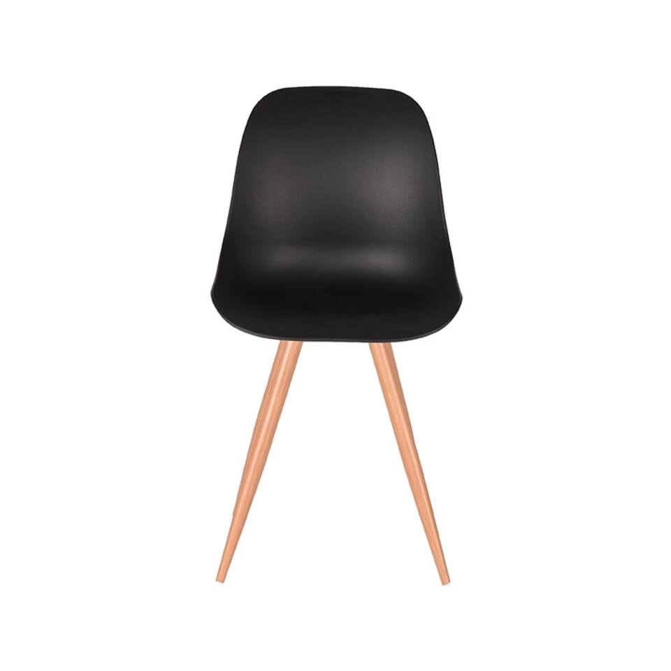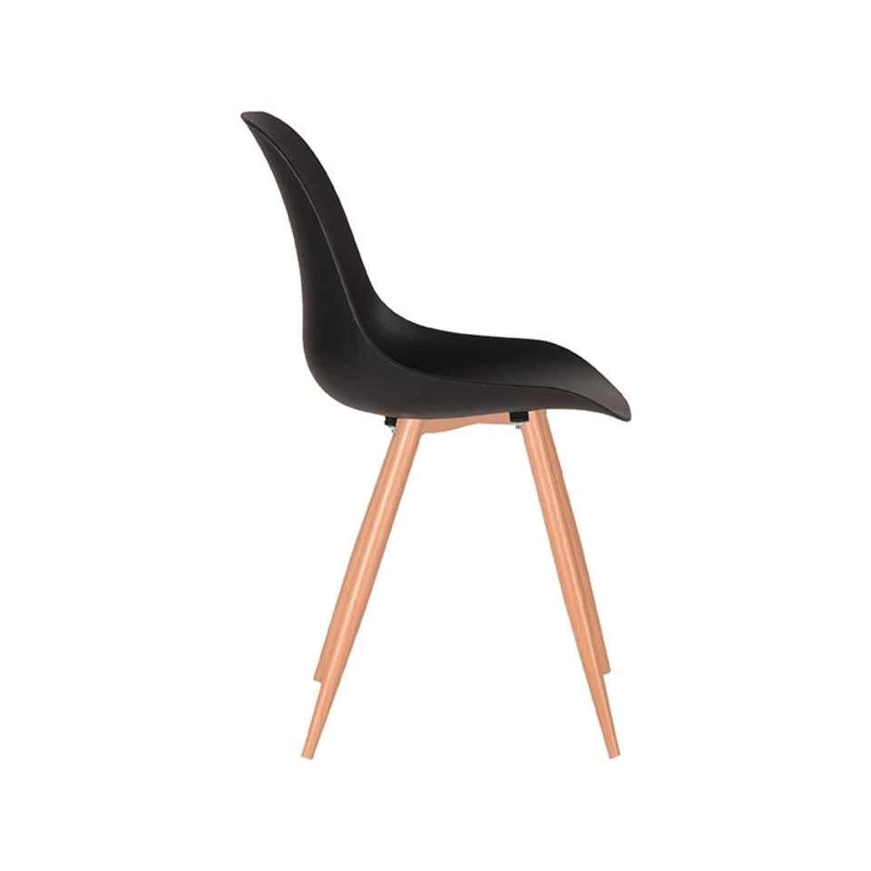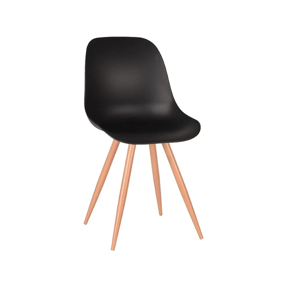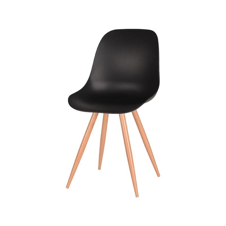 Eetkamerstoel Rimini, uitgevoerd in zwart polypropyleen heeft een zeer luxe en comfortabele kuip voorzien van elegante rondingen. Het materiaal is duurzaam en zeer gebruiksvriendelijk. Tevens is Rimini in het bezit van licht uitlopende metalen poten voorzien van een cover met houtstructuur waardoor de stoel stevig op de grond staat en ook nog eens een frisse, speelse touch krijgt.