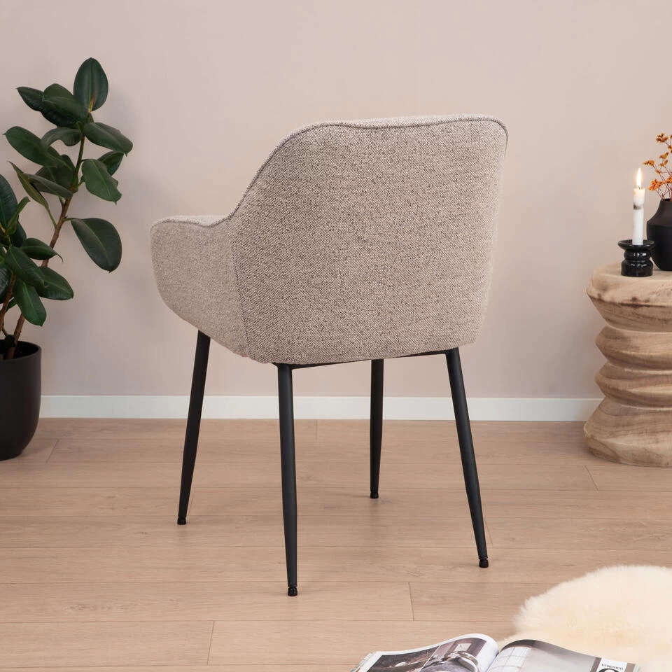Voeg karakter toe aan je eethoek met dit tijdloze silhouet. Bekleed met een beige bouclé stof is deze eetkamerstoel geschikt voor een lang diner. Tufting details voegen textuur en structuur toe aan de zitting, die wordt ondersteund door schuine poten in een zwarte ruwe poedercoating.