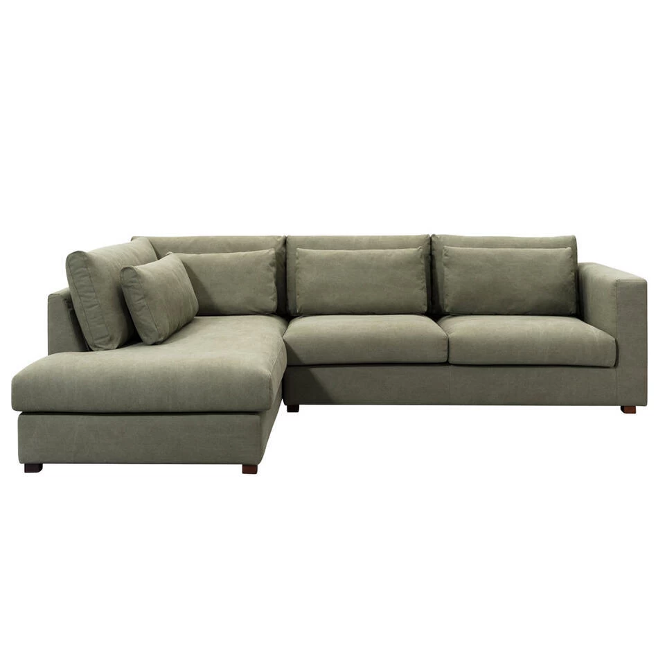 Deze bank is gestoffeerd met stof Bavo in de kleur olijfgroen.