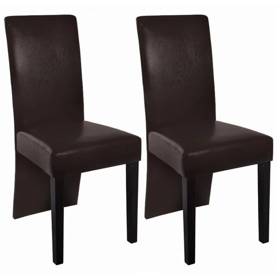Deze mooie eetkamerstoelen hebben een modern ontwerp en vallen zeker op in je keuken of woonkamer. De stoelen zijn gemaakt van donkerbruin kunstleer en de zittingen zijn gevuld met comfortabele voering. Dit zorgt ervoor dat je comfortabel aan tafel zit tijdens de maaltijd, tijdens een gezelschapsspel en bij andere activiteiten.